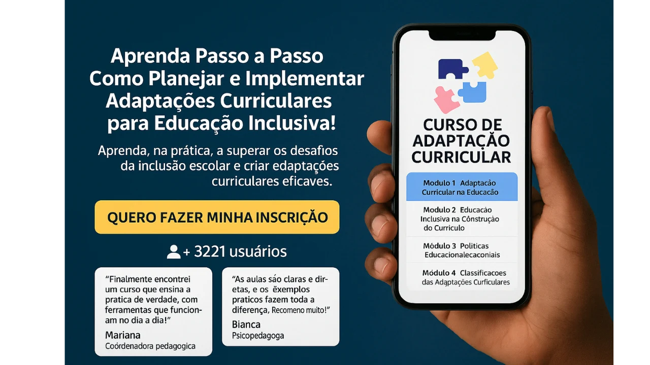 Diferentemente de outros cursos que focam apenas na teoria, o Curso de Adaptação Curricular na Prática oferece uma abordagem prática, com exemplos concretos, estudos de caso e ferramentas que você pode aplicar imediatamente. Ele foi desenvolvido por especialistas que compreendem os desafios reais enfrentados por educadores no Brasil.